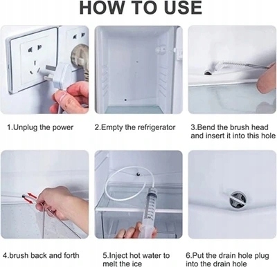 1. Narzędzia do koparki: czyści otwór odpływowy lodówki, eliminuje problem wycieków i usuwa zapach spowodowany zapchaniem.