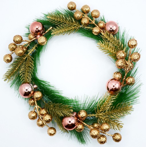 Wianek udekorowany jest w złote gałązki jarzębiny, złote gałązki świerku oraz bombki w odcieniu różu koralowego.