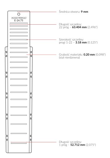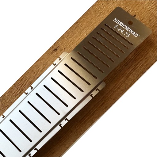 Osłona E-24.75 pasuje do współcześnie produkowanych gitar ze skalą 24.75″ i maksymalnie 22 progach, gdzie położenie progów obliczono wykorzystując współczynnik 17.817. Taka skala pojawia się np. w różnych wariacjach modeli LP, SG wielu producentów (LTD, ESP, Schecter, Epiphone…).