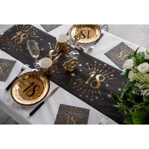 Prestiżowy czarny bieżnik na 18 urodziny ze złotym nadrukiem liczby 18 i gwiazdkami oraz iskierkami dookoła. Doskonały by podkreślić wyjątkowość przyjęcia urodzinowego. Zwinięty na rolce o szerokości 30cm i długości 5m.