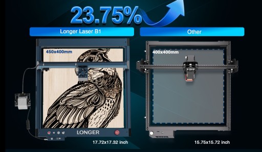 Laser B1 może pochwalić się obszarem roboczym 450 x 440 mm, co stanowi wzrost o 23.75% w stosunku do konkurencji. Jest to idealne rozwiązanie dla paneli A3.