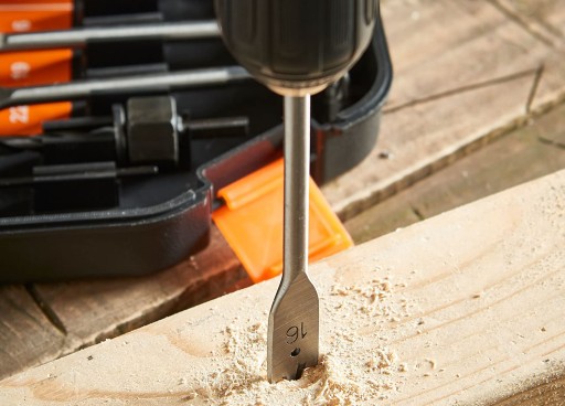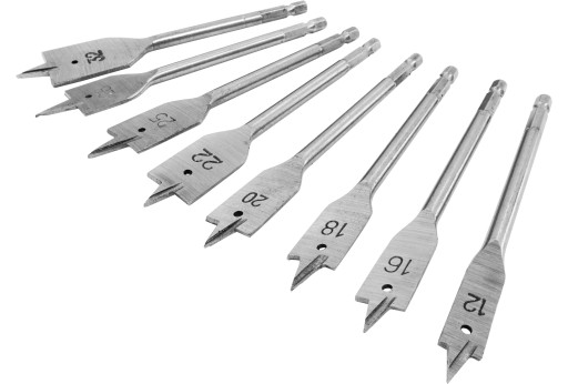 Zestaw wierteł łopatkowych. Wysokiej jakości, wykonane z utwardzanej stali węglowej, hartowane. Przeznaczone do wiercenia zarówno w drewnie, płycie meblowej, tworzywach sztucznych, jak i w płycie gipsowej i gazobetonie. Uchwyt sześciokątny 1/4" z końcówką typu "quick change", umożliwiającą szybką wymianę wiertła w uchwytach wkrętarek.