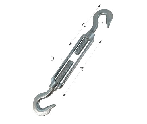 Śruba przeznaczona jest napinania lin stalowych, polipropylenowych i przewodów. Liny przeciąga się przez haki a następnie reguluje napięcie poprzez skręcenie przeciwległych śrub do żądanej długości. Liny można dodatkowo zabezpieczyć przed zsunięciem za pomocą zacisków a zaczepić za karabińczyki lub ogniwa do innych części konstrukcyjnych.