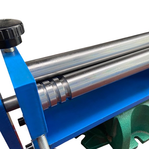 - Giętarka do blachy może być z łatwością zamontowana na stole roboczym i zapewnia wytrzymałość i stabilność w przypadku odkształcenia blachy. Wałek posiada regulowane pokrętła, które umożliwiają operatorowi regulację odstępu pomiędzy rolkami w celu kontrolowania promienia końców i dostosowania do różnych grubości blachy.