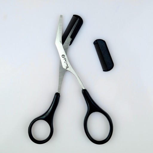 Specjalistyczne precyzyjne nożyczki przeznaczone do przycinania i stylizacji brwi zaopatrzone w grzebyk ułatwiający ułożenie brwi przed ich przycięciem.