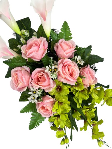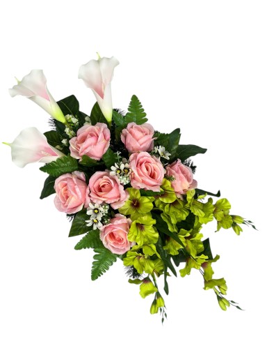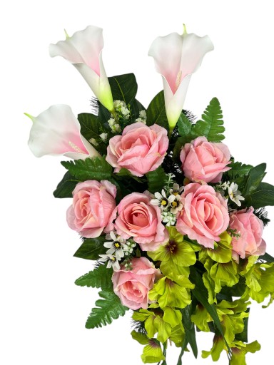 WIĄZANKA STROIK KOMPOZYCJA SZTUCZNE KWIATY KOMPLET NA GRÓB RÓŻA KALIA MIECZYK