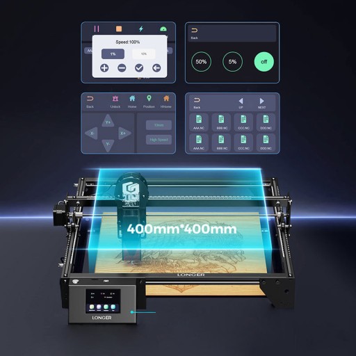 Dzięki technologii podwójnej wiązki grawer laserowy LONGER Ray5 ma większą moc lasera, co umożliwia wykonanie efektu cięcia i grawerowania. Jest w stanie regulacja deskę drewnianą o grubości 20 mm i akryl o grubości 30 mm. Charakteryzuje się rozmiarem grawerowania 400 x 400 mm i szybkością grawerowania 10000 mm/min .