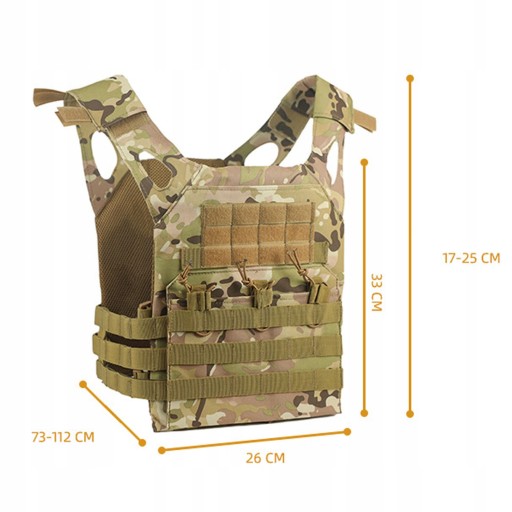 WYSOKA JAKOŚĆ: Kamizelka taktyczna składająca się z tkaniny, nici o wysokiej wytrzymałości na rozciąganie i taśmy jest wyposażona w kieszeń na mapę i trzy modułowe, wytrzymałe panele na magazynki. Wyposażona jest w dwa stabilne paski boczne oraz regulowane, wyściełane paski na ramię. Kamizelki Airsoft są w pełni wyściełane oddychającą siateczką 3D, która jest wygodna i zapewnia chłód, umożliwiając cyrkulację powietrza.