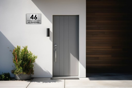 Tabliczka/adresówka z numerem na dom oraz z nazwą ulicy lub miejscowości.