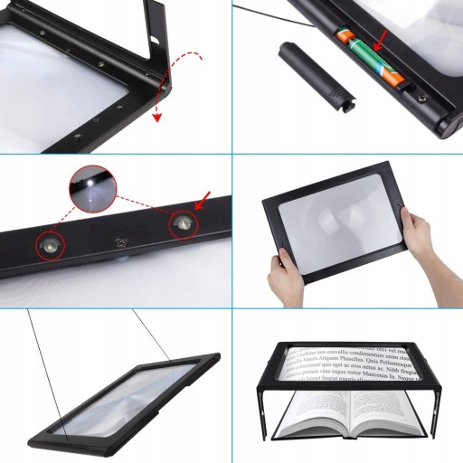 Szkło powiększające bez użycia rąk pozostaje nad stroną, idealna wysokość dla optymalnego powiększenia;