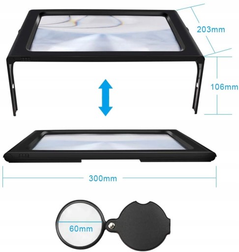 【Gwintowana optyczna lupa do czytania】 Soczewka wykonana jest z materiału PVC, szkło powiększające ze światłem jest przezroczyste, niełatwe do odkształcenia, równomiernie powiększające i nieszkodliwe dla oczu; Rozmiar 30 * 20,3 cm, Duży obszar widzenia, Krystalicznie czysty obraz, Dzięki naszej prostokątnej lupie do czytania LED możesz patrzeć na cały arkusz papieru A4 i czytać książki.