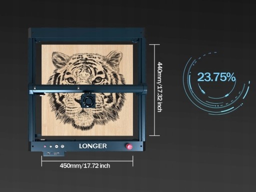 Obszar roboczy 17,72 x 17,32 cala / 450 x 440 mm, Laser B1 20W zapewnia wzrost rozmiaru roboczego o 23,75% w porównaniu do innych, co spełnia większość scenariuszy, szczególnie idealnie nadaje się do paneli A3.
