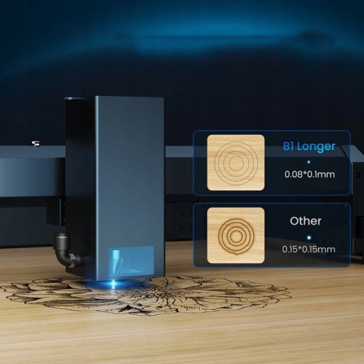 Dzięki najnowocześniejszej technologii sprzęgania lasera laser B1 20 W ma cieńszą i dłuższą ogniskową (50 mm), ale mocniejszą wiązkę lasera, która zwiększa możliwości cięcia o 20% + silniejsze w porównaniu do other laserów 20 W. Może ciąć lipę o grubości 20 mm i czarny akryl o grubości 35 mm w wielu przejściach.