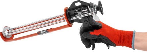 Wyciskacz do mas gęstych. Lekki, wykonany z blachy stalowej, lakierowany. Wygodny, profilowany, ergonomiczny uchwyt, pozwala na skuteczne aplikowanie mas gęstych np. silikonu, klejów, uszczelniaczy, smarów itp. Wzmocniona konstrukcja, potrójne prowadzenie tłoka, zwiększa siłę nacisku i skuteczność aplikacji, szczególnie istotne przy wyciskaniu gęstych, kleistych substancji lub podczas pracy w niskich temperaturach twardniejące masy są trudne do wyciśnięcia i powodują często zniszczenie słabych wyciskaczy.
