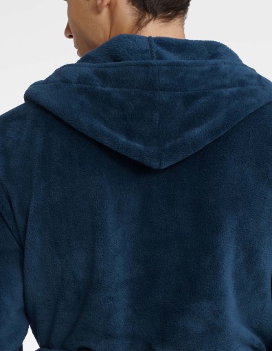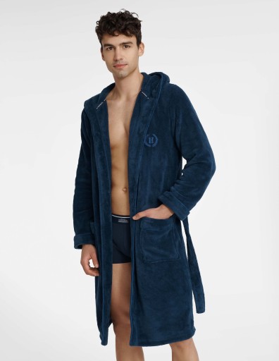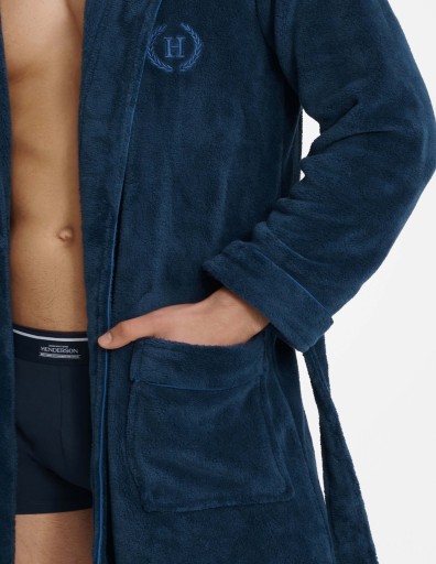 Szlafrok męski Until marki Henderson to propozycja o klasycznym i prostym kroju, który doskonale chroni przed zimnem i zapewnia swobodę ruchów. Ten granatowy szlafrok posiada kaptur, pasek do regulacji oraz dwie kieszenie, które dodają mu funkcjonalności.