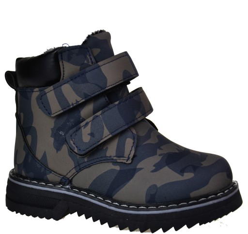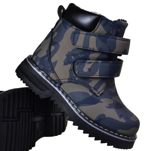 Traperki zimowe dziecięce botki na płaskim. Botki w pięknym kolorze moro w 3 kolorach czarnym, zielonym i niebieskim. Na pozostałych aukcjach. Zapięcie na suwak i dodatkowo RZEPY to wygoda nakładania. Buciki mają anty poślizgową gumową podeszwę z bieżnikiem. Dobrze trzymają stopę i dopasują się do każdej nogi. Buty posiadają ocieplenie w całości buta