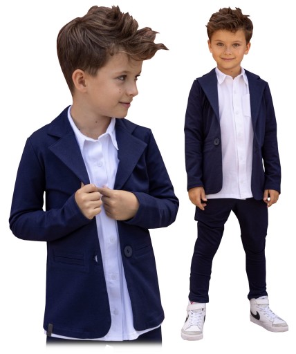 Marynarka prezentuje się fantastycznie, wykonana z elastycznego materiału, który nie krępuje ruchów dziecka.