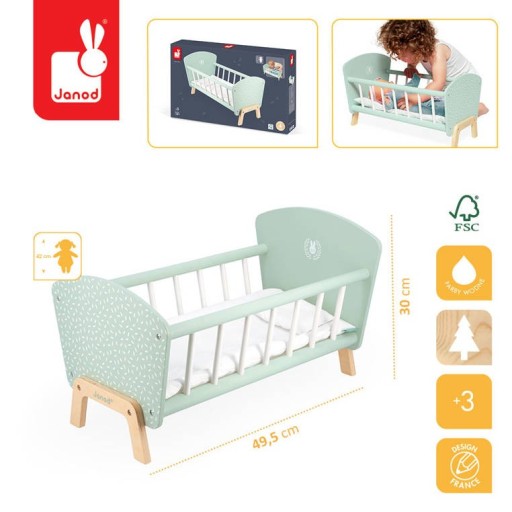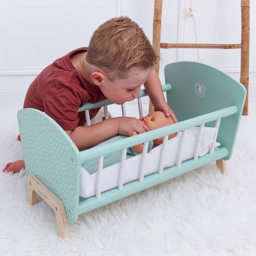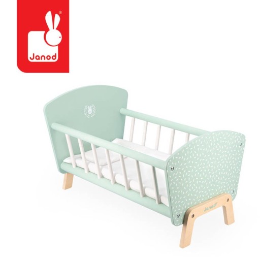 Drewniane łóżeczko dla lalek z kolekcji Zen francuskiej firmy JANOD to świetna zabawka dla każdego dziecka, które lubi się bawić w naśladowanie dorosłych. Łóżeczko przeznaczone jest do układania i usypiania lalek lub pluszaków do 42 cm wysokości. Ma zaokrąglony kształt w stylu retro, piękny jasny kolor z elementami w naturalnym odcieniu drewna, stabilne szeroko rozstawione nóżki, szczebelki oraz poduszkę i kołderkę na wyposażeniu. Jest starannie wykonane i bardzo estetyczne, a zabawa nim to czysta przyjemność – opiekowanie się i lulanie „maluszka” pomaga dzieciom oswajać się z codziennością i przyswajać zasady społecznych zachowań.