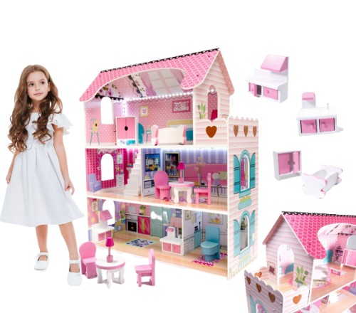 КУКОЛЬНЫЙ ДОМИК ДЕРЕВЯННАЯ МЕБЕЛЬ МДФ СВЕТОДИОДНОЕ ОСВЕЩЕНИЕ БОЛЬШОЙ XL