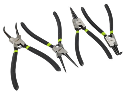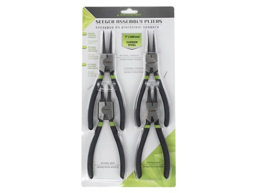 Zestaw szczypiec zawiera 4 rodzaje, umożliwiające pracę z różnymi rodzajami pierścieni Seegera:
