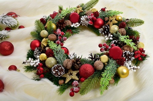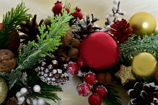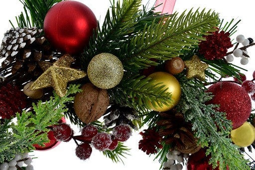 ✅ Bombki w różnych odcieniach złota oraz czerwieni, sprawiają, że cały wianek prezentuje się wprost niesamowicie.