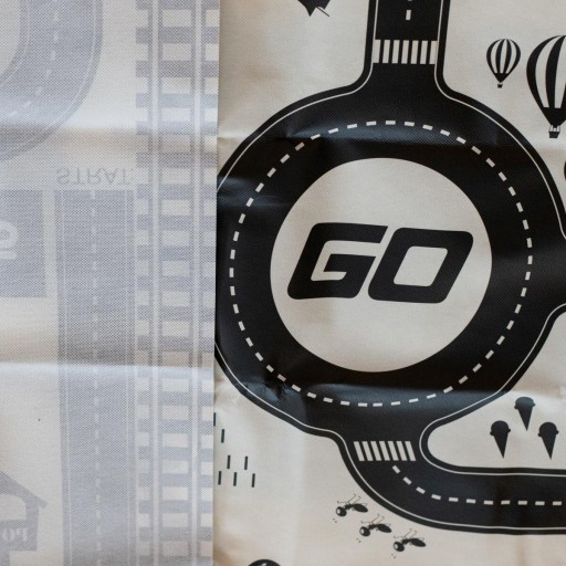 Wodoodporna, cienka mata ze wzorem miasta. Pomocna w nauce przepisów drogowych. Wykonana z tworzywa sztucznego przypominającego ceratę. W zestawie mata, figurki znaków drogowych i naklejki. Dostępna w kolorze kremowo-czarnym. Wymiary: 130x100cm.