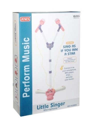 Zabawka mikrofon do zabawy dla małych piosenkarzy. W zestawie znajdują się 2 mikrofony więc dzieci mogą bawić się ze swoimi kolegami lub też z rodzeństwem czy z rodzicami. Do zabawki można też pod łączyć odtwarzacz MP3 lub telefon komórkowy. Mikrofon zasilany jest na baterie typu AA. Baterie nie są załączone w zestawie. Całość zapakowana jest w kartonowe opakowanie. Zabawka dla dzieci powyżej 3 lat.