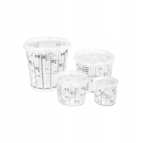 Uniwersalne pojemniki z przeźroczystego tworzywa z nadrukowaną podziałką umożliwiającą przygotowanie mieszanki w żądanej proporcji.