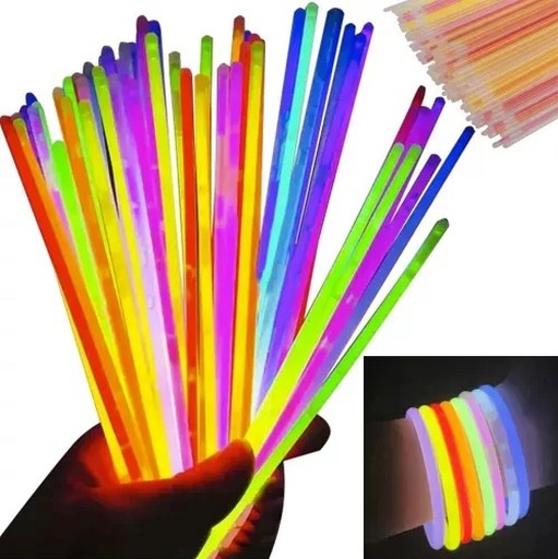 - ELASTYCZNE BRANSOLETKI - są to elastyczne pałeczki, które bez problemu połączymy w bransoletkę czy opaskę. Wykonane z tworzywa sztucznego. Wewnątrz znajdują się dwa składniki chemiczne, które podczas "łamania" łączą się ze sobą, wytwarzając światło.