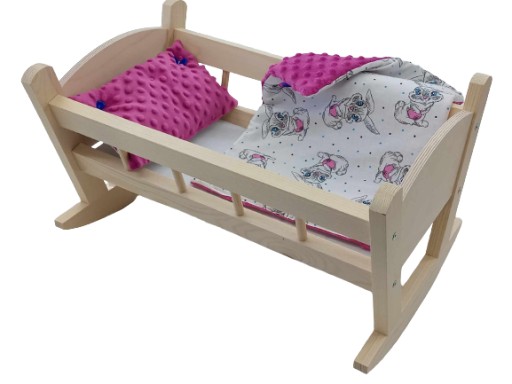 Urocza kołyska drewniana dla lalek, wykonana z drewna świerkowego.