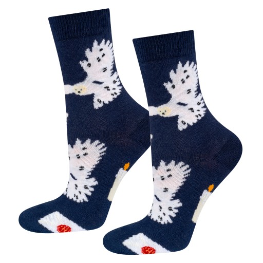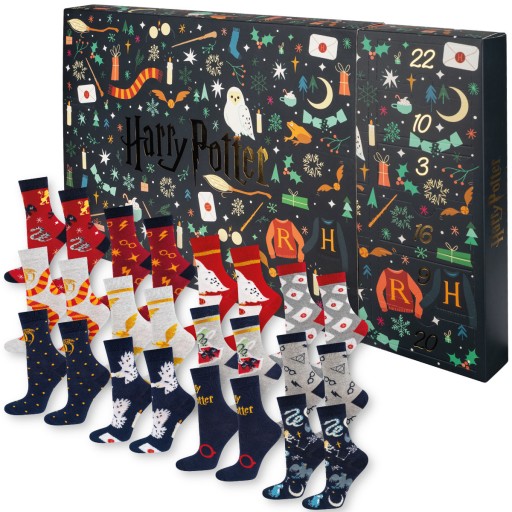 - Skarpetki w pudełku z najwyższej jakości bawełny z motywem Harrego Pottera zapakowane w kartonik przypominający kalendarz adwentowy.