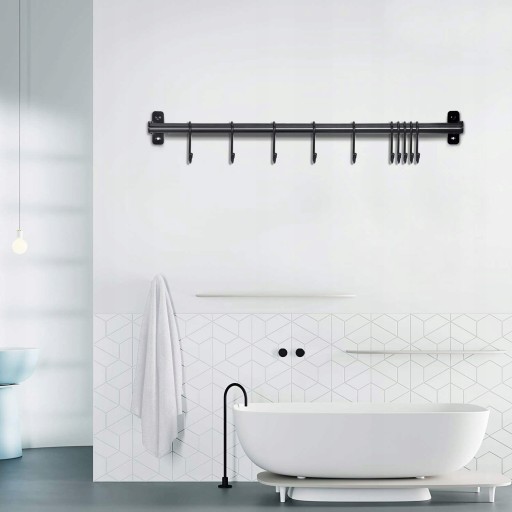 Z ruchomymi haczykami: Reling z 10 ruchomymi haczykami w kształcie litery S. Odległość między haczykami można łatwo ustawić w zależności od wielkości przyborów kuchennych.