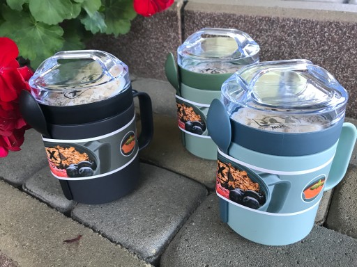 Szczelnie zakręcany kubek. Dołączony pojemnik na płatki, owoce, musli. Dopinana łyżeczka.