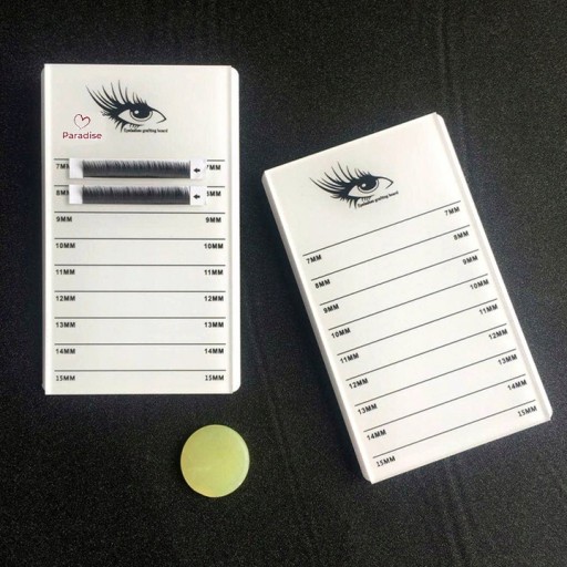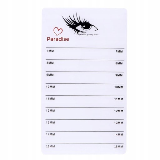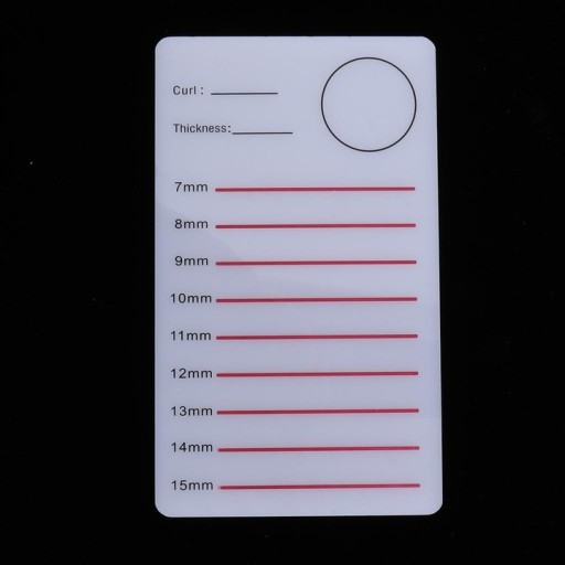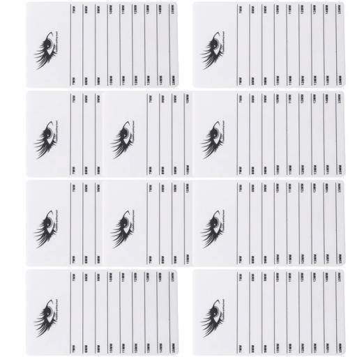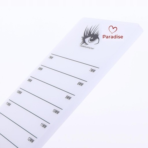 Podkładka pod rzęsy z numeracją długości, miejscem na klej oraz adnotację dotyczącą skrętu i grubości rzęs, na których w danym momencie pracujemy. To niezbędnik do pracy dla stylistek rzęs.