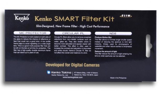 Zestaw filtrów Kenko Smart Filter składa się z 3 filtrów: Protector, Circular PL i ND8. Protector jest używany jako ogólna ochrona soczewki. Wykonany z wysokiej jakości szkła wielowarstwowego, Smart Protector nie wpływa na jakość obrazu. Okrągły filtr PL jest podstawowym filtrem z efektem polaryzacji eliminującym niepożądane odbicia lub w celu zwiększenia nasycenia i kontrastu nieba oraz przyrody. Filtr ND8 (Neutralne Gęstość) zmniejsza objętość światła przechodzącego przez soczewkę, aby uzyskać 8-krotnie dłuższą szybkość migawki lub większą wartość przysłony podczas słonecznego dnia lub naśladować ruch rozmycia wody i poruszających się obiektów.