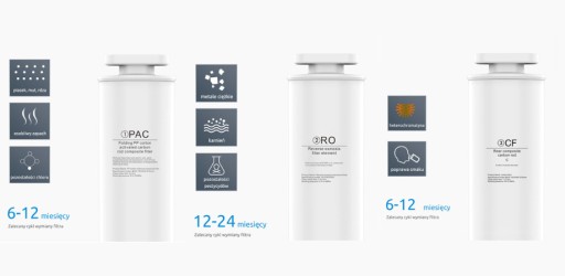 - Filtr kompozytowy CF (z włókna węglowego) – poprawiający smak wody i usuwający nieprzyjemną dla oka barwę oraz opcjonalnie mineralizujący wodę.