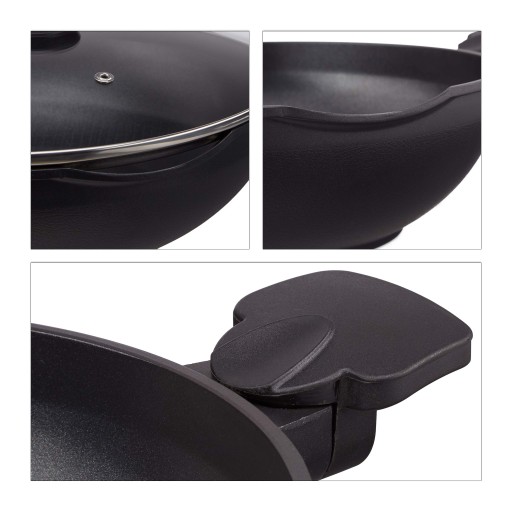 - nazwa typu elementu: Relaxdays Patelnia wok ze szklaną pokrywką 30 cm, wok z powłoką zapobiegającą przywieraniu do kuchenki gazowej, elektrycznej, uchwyt, 4 litry, czarna