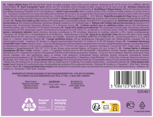Rączka maszynki wykonana jest z tworzywa pochodzącego w 40% z recyklingu, co przyczynia się do zmniejszenia zużycia plastiku przez firmę BIC