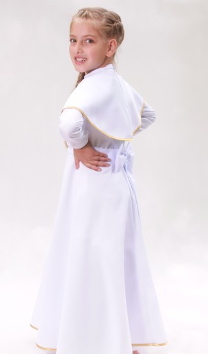 ALBA komunijna dziewczęca długa firmy SOMIR ze złotymi dodatkami w rozmiarze 134 S - oferta dla dziewczynek o szczupłej sylwetce.