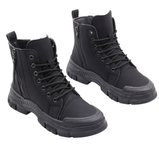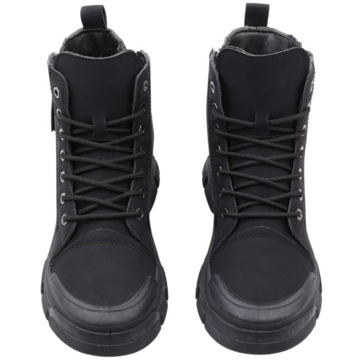 Traperki botki na bardzo masywnej podeszwie z protektorem. Wykonane z nubuku syntetycznego. Z tyłu mała pętelka. Z przodu znajduje się wiązanie na sznurowadła. Okrągłe noski. Ocieplone. Lubisz nieoczywiste rozwiązania? Te traperki podkreślą Twój charakter. Fantastyczne z jeansami oraz spodniami cargo.