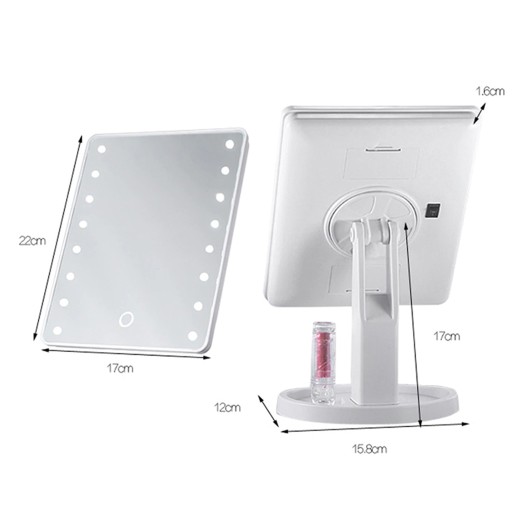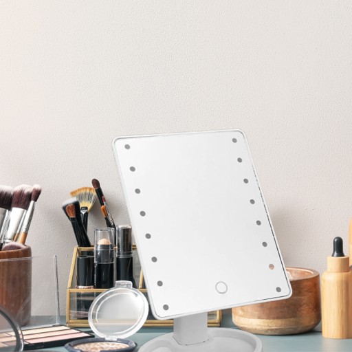 Lusterko kosmetyczne z powiększeniem wyposażone w aż 16 diod doświetlających LED po zewnętrznej stronie. Diody LED są uruchamiane dotykowo - wystarczy kliknąć w dowolnym miejscu lusterka, aby je aktywować i rozświetlić sobie przestrzeń roboczą np. w trakcie wykonywania makijażu.