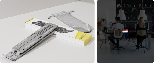 Podstawka Voomy umożliwia łatwą regulację wysokości. Pozwala to ustawić ekran na idealnym poziomie oczu dla ergonomicznej pracy. Składany design ułatwia składanie i zabieranie ze sobą. Dołączony pokrowiec ułatwia przechowywanie.