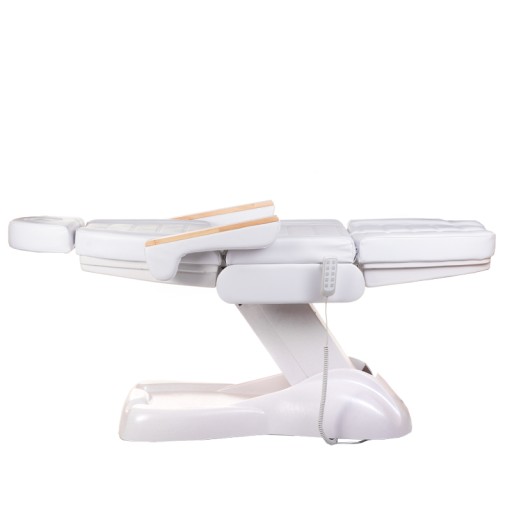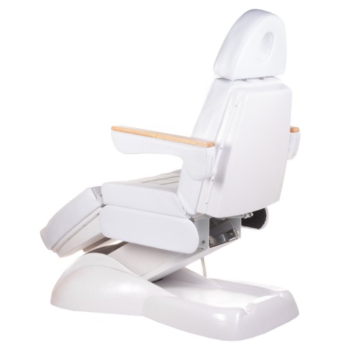 Piękna biała skóra ekologiczna, podłokietniki wykończone drewnem to powiew luksusu. Oferowany sprzęt kosmetyczny jest także bardzo praktyczny – prezentowany fotel kosmetyczny posiada otwór na twarz w zagłówku umożliwiający wykonywania masażu, a elektrycznie regulowana za pomocą pilota wysokość siedziska, kąt podparcia pleców i nóg oraz kąt pochylenia fotela zapewnia komfort codziennej eksploatacji.