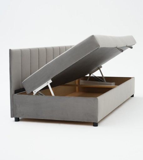 Tapczan tapicerowany FENIKS o wymiarach 90 x 200 cm z pojemnikiem w trwałej i modnej tkaninie welurowej w kolorze szarym.