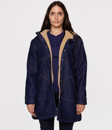 Jeansowa, dłuższa, ocieplana kurtka damska o regularnym fasonie. Nieodpinany kaptur, zapinana na guziki, regulacja przy mankietach, dwie kieszenie boczne i dwie piersiowe.