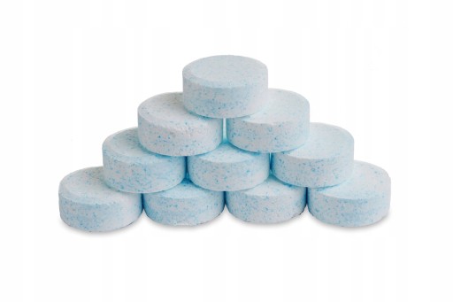 Dziesięć wolno rozpuszczających się tabletek chlorowych o działaniu bakteriobójczym do dezynfekcji wody w basenach kąpielowych.