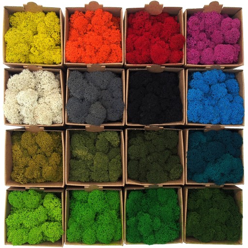 Chrobotek zbierany w lasach Finlandii ma naturalnie jasny, beżowy kolor. Do uzyskania innych kolorów farbowany jest przy użyciu naturalnych barwników, wytwarzanych na bazie wody, bezpiecznych dla środowiska naturalnego.Przy dotknięciu świeżego mchu może zdarzyć się, że barwniki pozostaną na rękach. Są one łatwo zmywalne przy użyciu np. mydła.