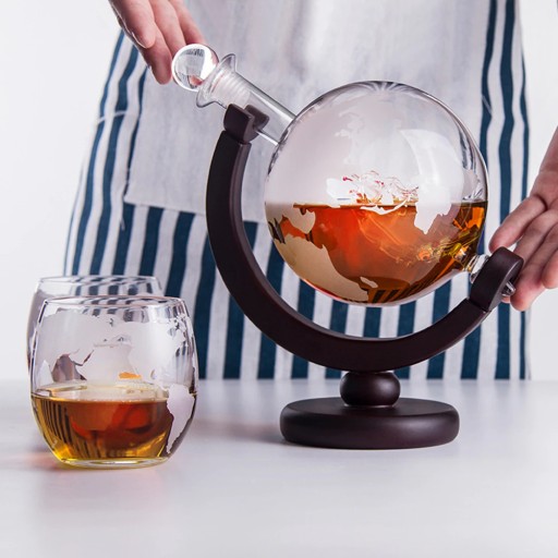 Piękna karafka w kształcie globusa z wygrawerowaną mapą świata, przyciągnie wzrok każdego gościa w domu lub biurze. Idealny gadżet dla Dzięki swojemu eleganckiemu, wyjątkowemu wyglądowi, karafka ucieszy każdego miłośnika tego złotego trunku. W butelce znajduje się "zatopiony" żaglowiec. Kafarka do whisky w kształcie globusa ze szklaną żaglówką wykonana jest z wysokiej jakości materiału, w zestawie z drewnianą podstawką. Elegancki prezent urodzinowy, walentynkowy, na Dzień Ojca, rocznicę ślubu lub po prostu bez okazji! :)