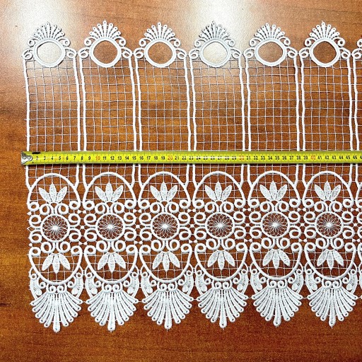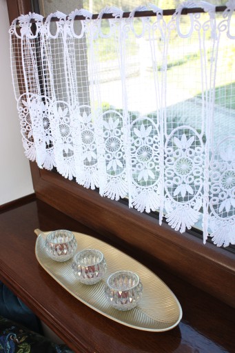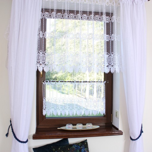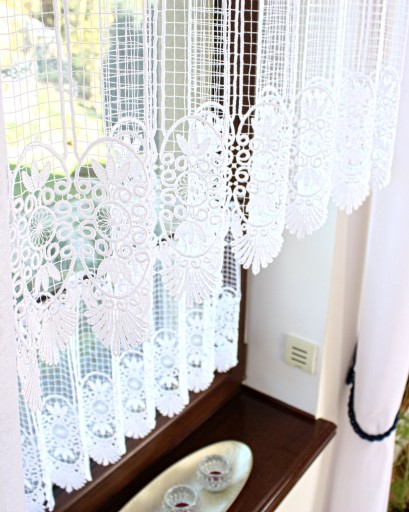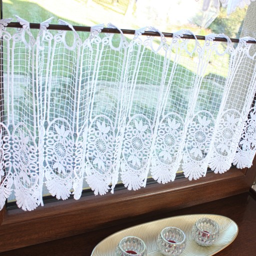 Przedmiotem sprzedaży jest gipiurowa śnieżnobiała firanka typu zazdrostka na szelkach o wysokości całkowitej 60 cm, pomimo zastosowania techniki przeplatania nici w grupach firaneczka nie jest zbyt ciężka , zastosowany ażurowy wzór nadaje lekkości i przejrzystości Firaneczka jest cięta z walka i nie wymaga obszywania , bardzo ważną cechą jest również to że nie trzeba jej prasować, dodatkowa zaletą jest fakt że można taką zazdrostkę powiesić również na żabkach karnisza.
