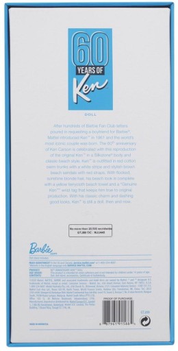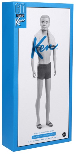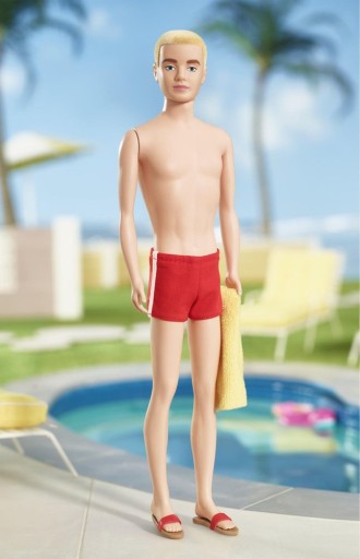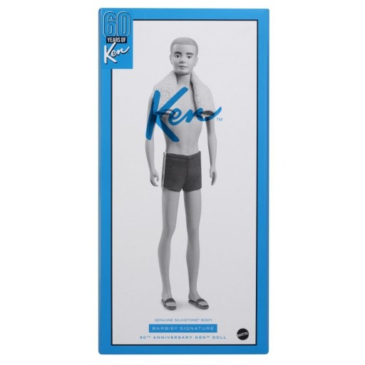 After hundreds of letters poured in requesting a boyfriend for Barbie, Mattel introduced Ken in 1961 and the world's most iconic couple was born. The 60th anniversary of Ken Carson is celebrated with this reproduction of the original Ken doll featuring a Silkstone body and classic beach style. Ken is outfitted in red cotton swim trucks with a white stripe and stylish brown beach sandals with red straps. With flocked, sunshine blonde hair, his beach look is complete with a yellow terry cloth towel. A Genuine Ken wrist tag keeps him true to the original production and makes him the perfect gift for Barbie fans and collectors. With his classic charm and dashing good looks, Ken is still a doll, then and now. Includes doll stand and Certificate of Authenticity. Doll cannot stand alone. Colors and decorations may vary.